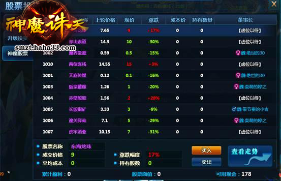 股票系统,游戏里最为人性化的一种玩法。玩家可以在游戏的市场里叱咤风云。股票系统为模拟真实股票运作的玩法,共10支股票供玩家选择。玩法很现实的炒股差不,相比之下还更简单。就是通过查看走势来判断该股市趋势。玩家对某支股票的持有量达到最高时,可获得该股票的董事长称号。需要注意的是目前股票只支持元宝投入和元宝产出。